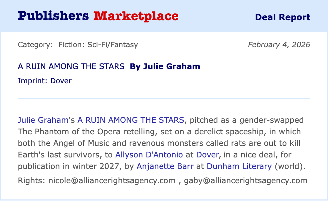 Julie Graham has degrees in Art History and Library Science, and spends her time writing slightly spooky stories, cross-stitching haunted houses, running half marathons, and homeschooling her four children. Her debut novel, A Ruin Among the Stars will release from Dover Books’ Midnight Rose imprint in 2027.